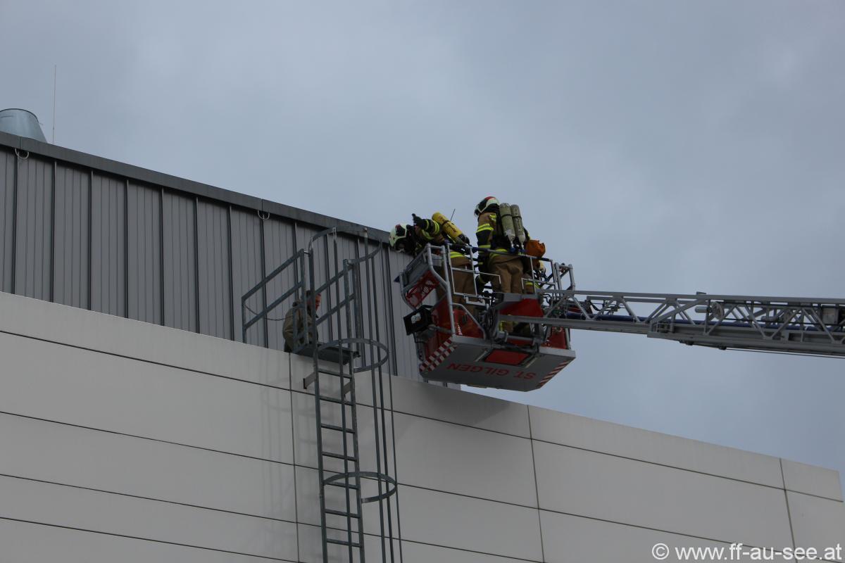 Der AS-Trupp begann daraufhin mit der Personensuche und konnte nach kurzer Zeit bereits die 1. Person retten, die AS Trupps aus Unterach und Abersee übernahmen dann wechselweise ebenfalls die Personensuche. Über die Drehleiter St. Gilgen konnten vom Dach des Firmengebäudes 2 weitere Personen gerettet und an den Rettungsdienst übergeben werden. Im Zuge der Suche wurden auch 2 Behältnisse mit Gefahrgut aus dem Gebäude verbracht.
