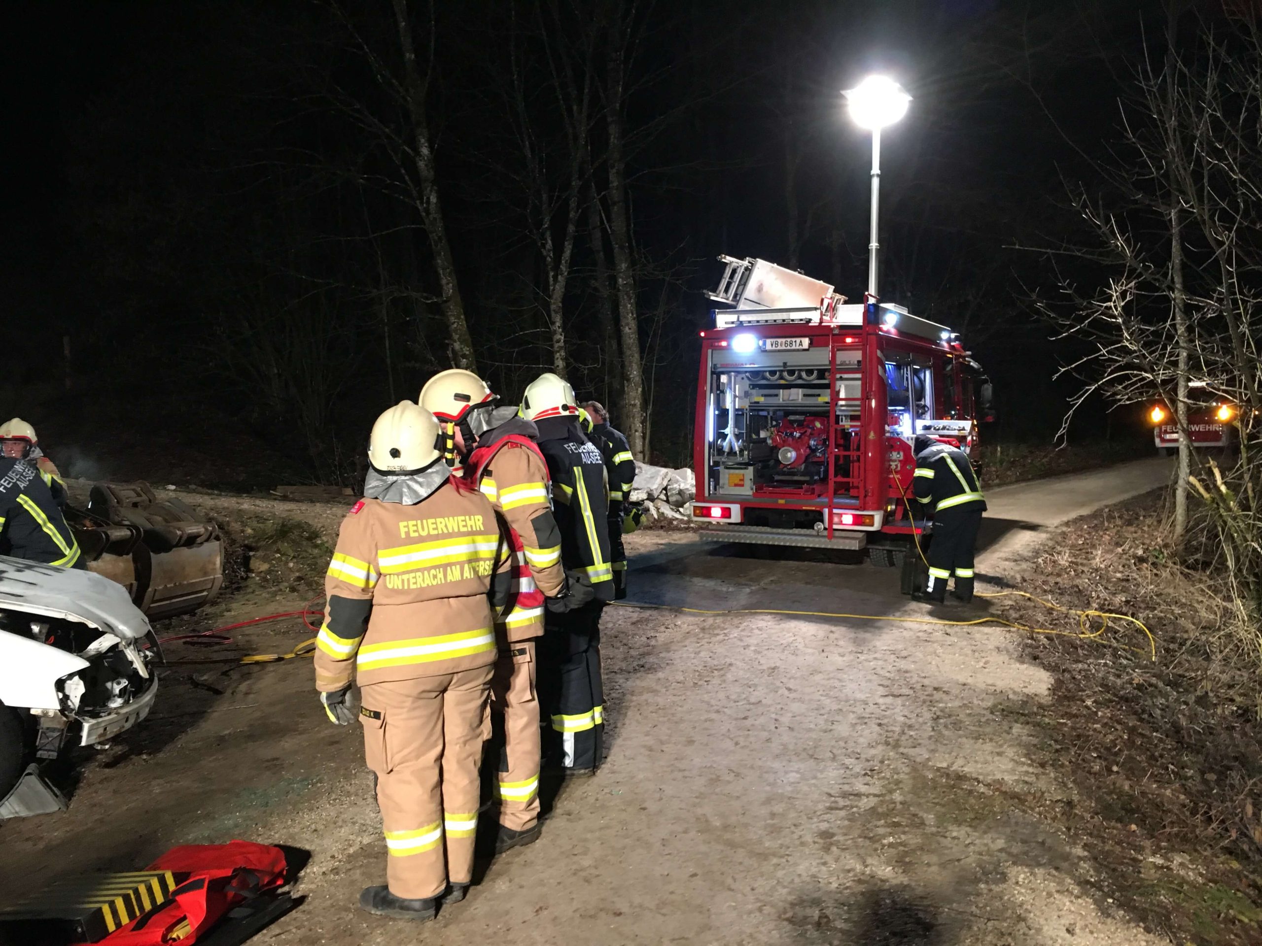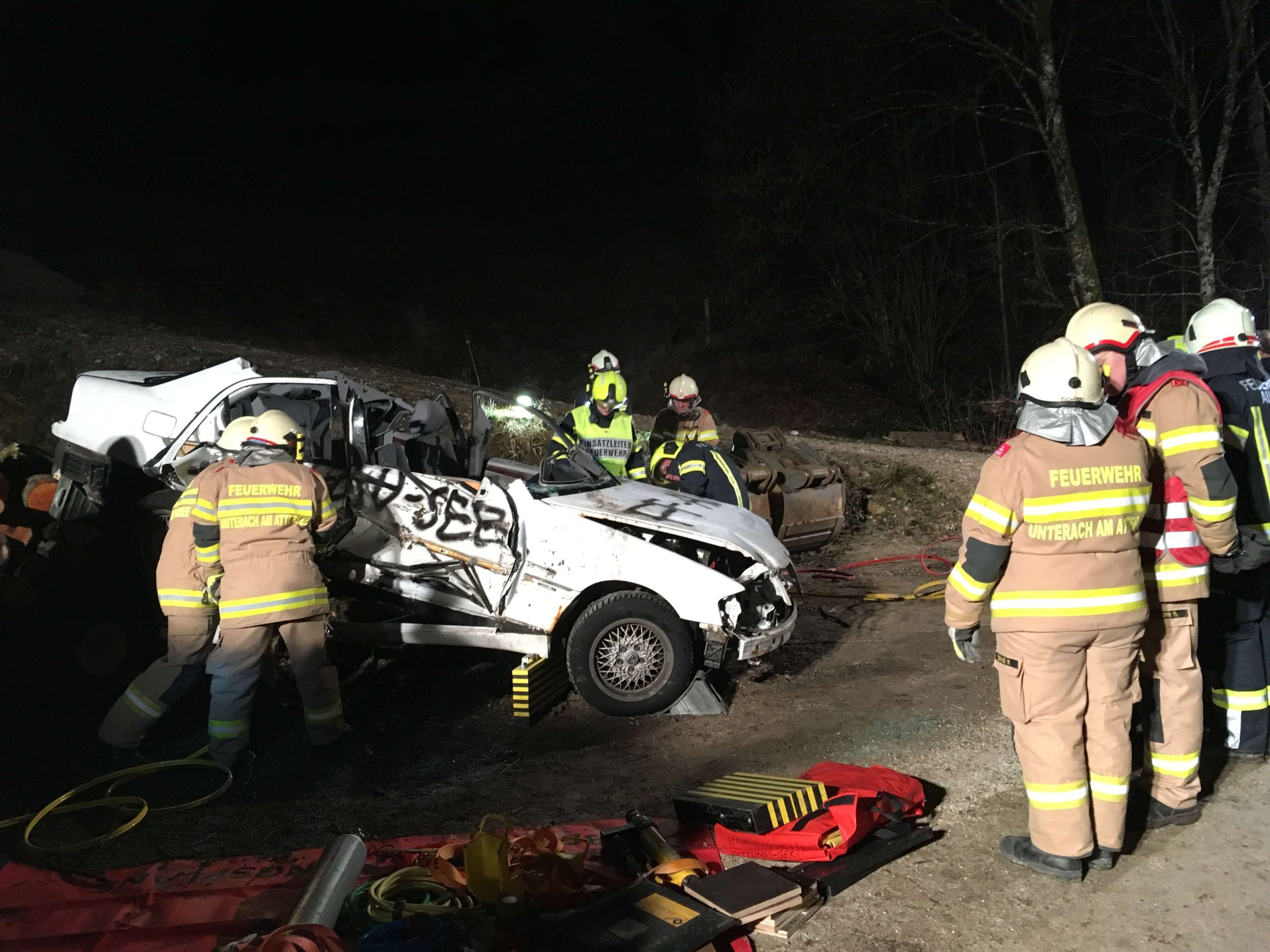 Nach Anrücken der FF Au See wurde dann gleich bei einer ersten Sichtung durch den Einsatzleiter klar, das hier mit 1 Rettungsgerät nicht schnell genug voranzukommen war und somit wurde auch die FF Unterach am Attersee nachgefordert. Nach der Sicherung des Fahrzeuges wurde dann damit begonnen die Front- und Heckscheibe des verunfallten Fahrzeuges zu entfernen (primär um Zugang zu der verletzen Person zu erhalten). Unmittelbar danach wurde – nach Abklärung des Status der verunfallten Person durch RK-Personal – die Entfernung von Teilen des Daches sowie der Fahrertüre mittels Schere und Spreitzer vorgenommen um die weitere Rettung einzuleiten.